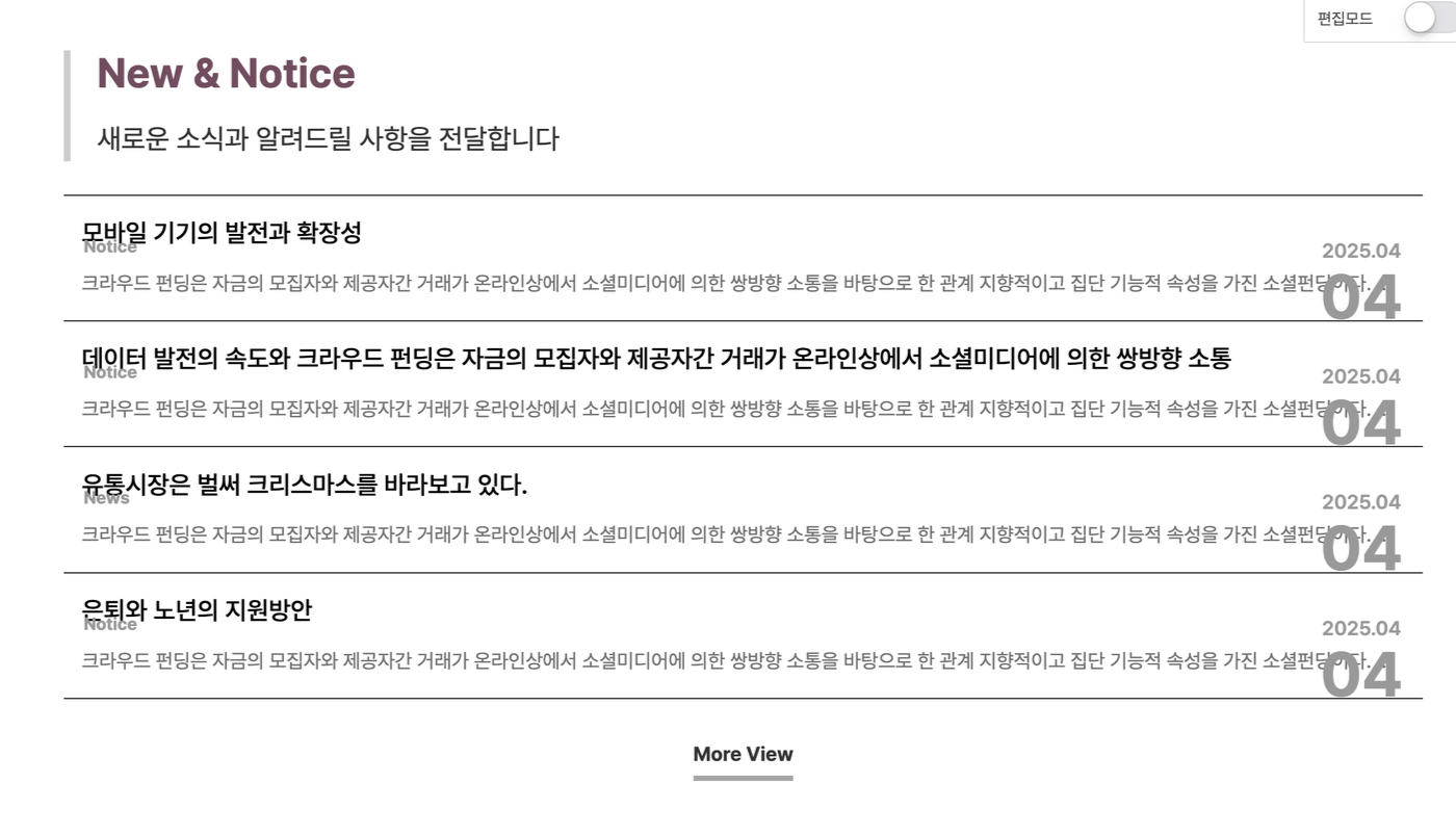 - 메인과 서브페이지에서 편집모드를 통해 손쉽게 내용 및 이미지 수정이 가능합니다.